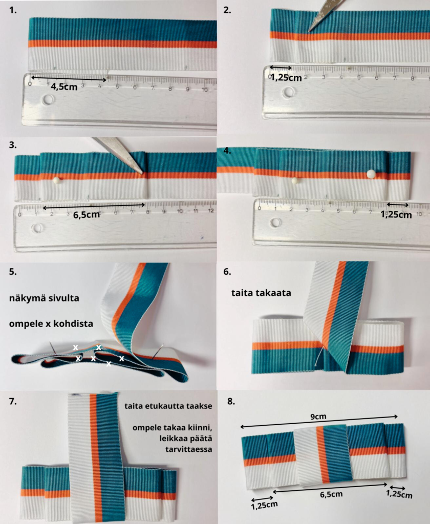 Ruusukkeen ompelemiseen tarvitset n. 45cm nauhaa. Ohjeet ruusukkeen ompelemiseen alla.