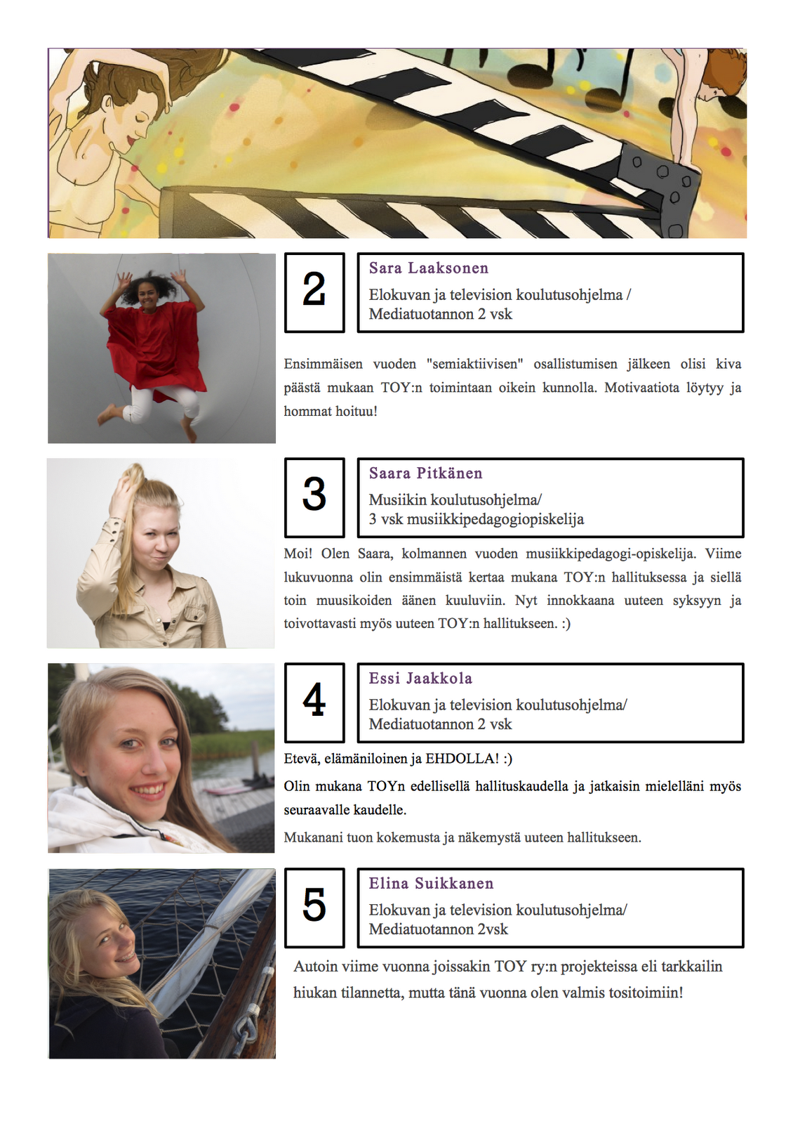 Alla näet opiskelijat, jotka ovat ehdolla kauden 2012-2013 hallitukseen. Voit edelleen ilmoittautua ehdolle osoitteeseen: pj@toyry.fi tai ilmoittautua paikan päällä.